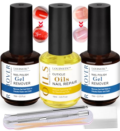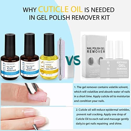 GEL POLISH REMOVER: LOUINSTIC gel nail polish remover kit comes with 2pcs gel remover 1pc nail cuticle care oil, a nail file, and a cuticle pusher, this gel nail remover kit will help to remove gel nail polish in minutes but no need for wrapping or for soaking. The cuticle oil will moisturize and strengthen your nails to help promote your natural nail growth and add shine.